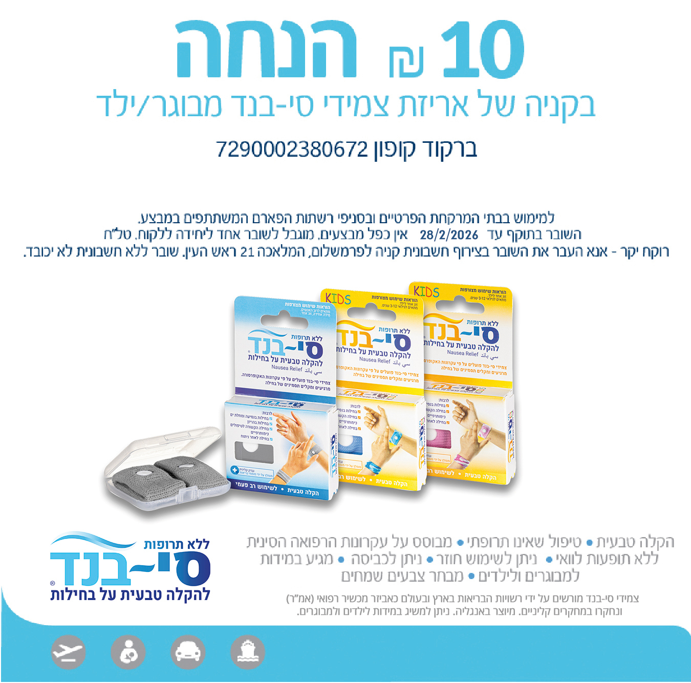 אנו סובלים מבחילות במקרים רבים: בעת נסיעה לטיול, בתחילת הריון או כתוצאה מטיפולים רפואיים. צמידי סי-בנד מסייעי להקלה טבעית ויעילה ללא תרופות בכל מקרי הבחילות.